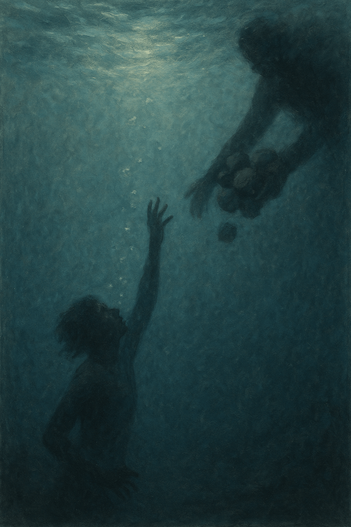 I thrash in the restless tide, the surface slipping farther from my grasp. My breath scatters into bubbles, and the sea folds me into its silence.